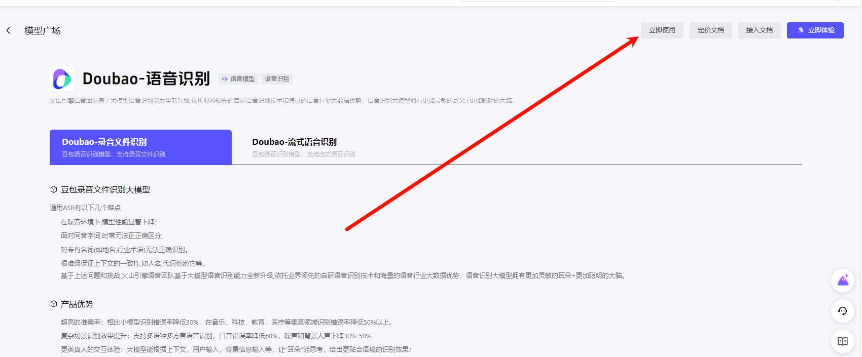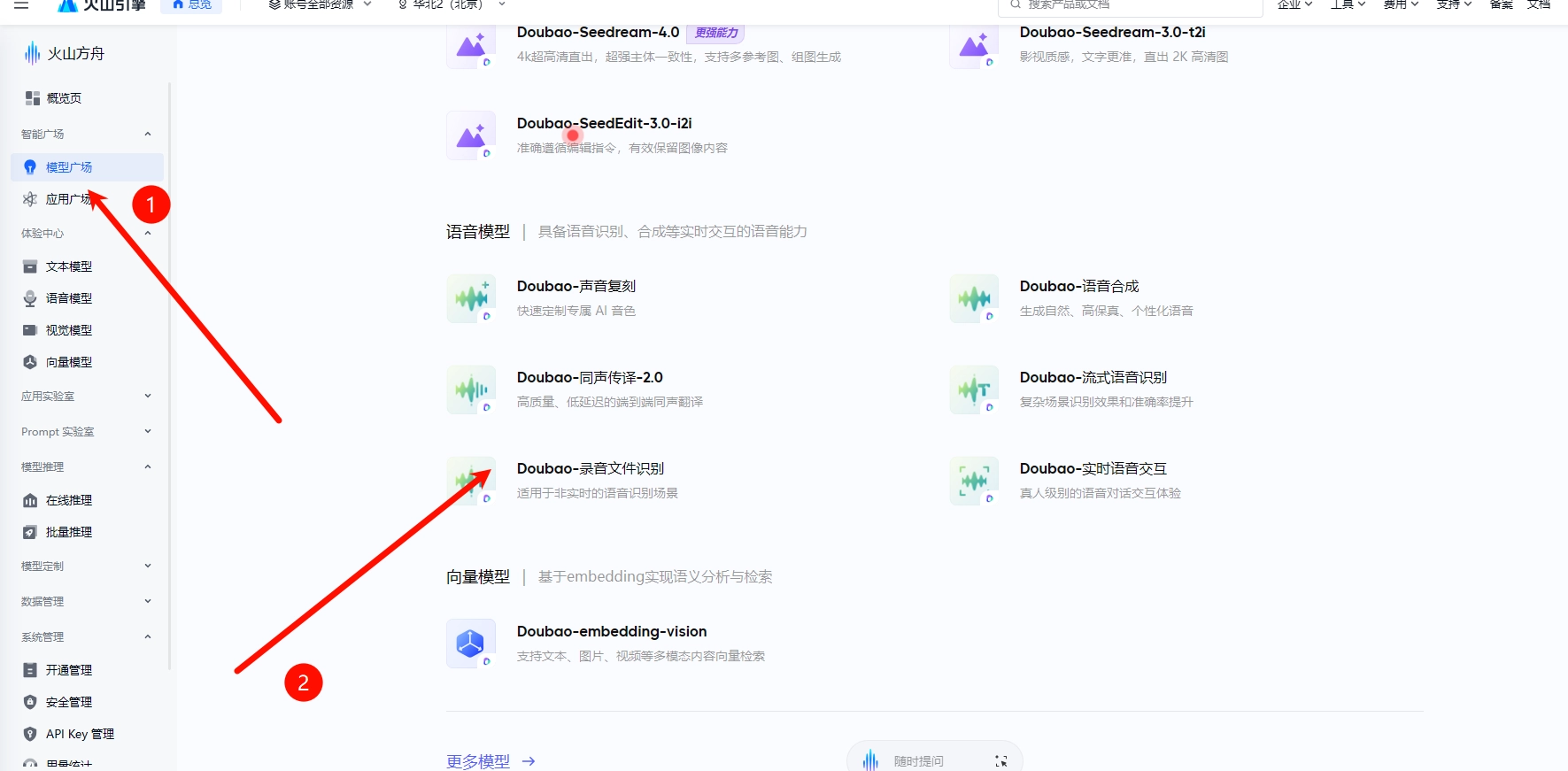 进入火山引擎控制台 点击左侧菜单栏的模型广场选择doubao-录音文件识别.如下图