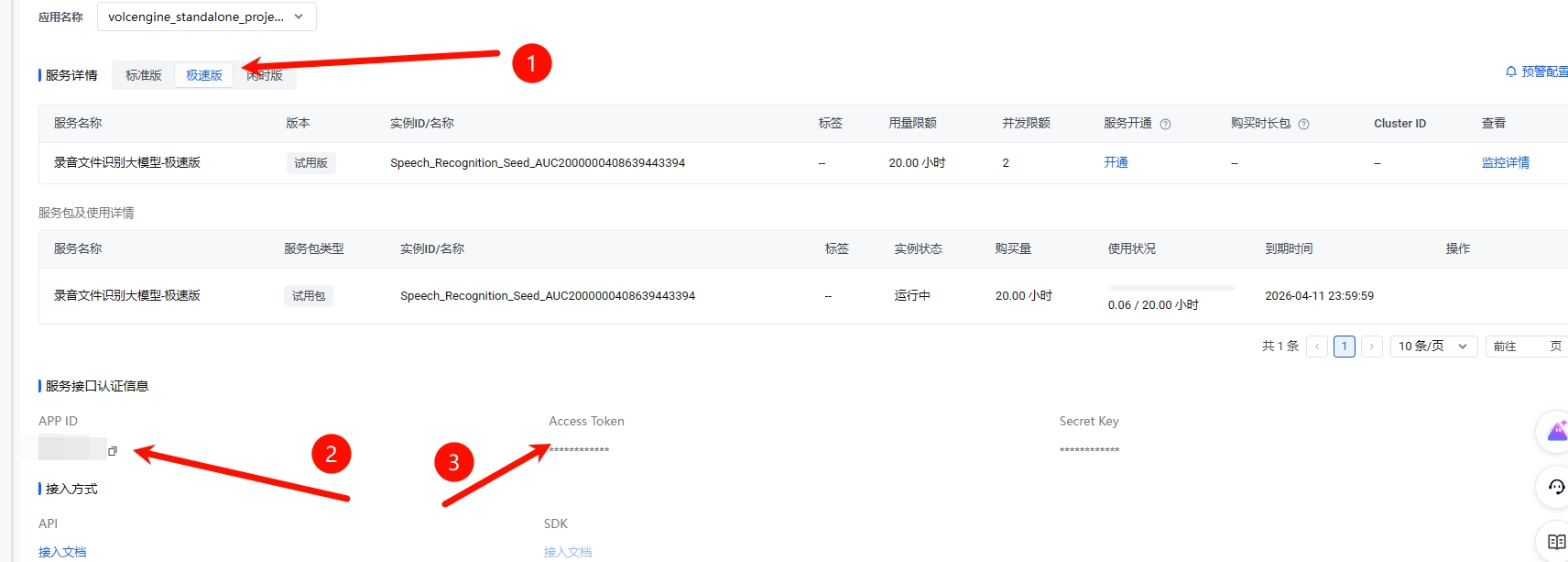 选择极速版,开通界面如下:复制APP ID和Access Token备用