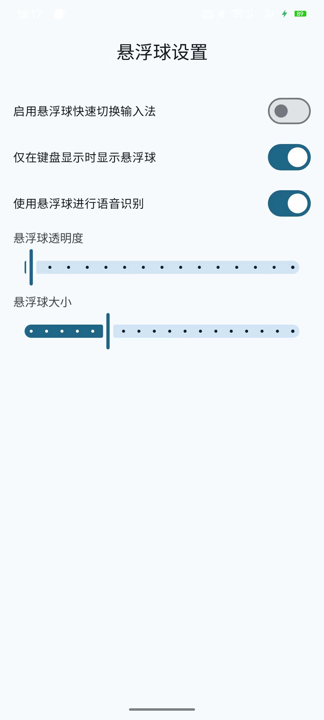下图是我的悬浮球设置,能在不影响默认输入法的情况下显示一个可见度不高的的语音悬浮球~点击即可进行语音输入. 你可以根据自己需求来修改悬浮球的大小和透明度