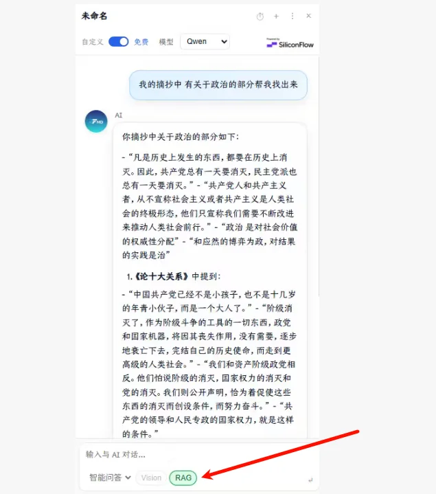 在任意文本或者空文本情况下 右键打开AI助手对话框,并点亮下方RAG图标 即可使用!