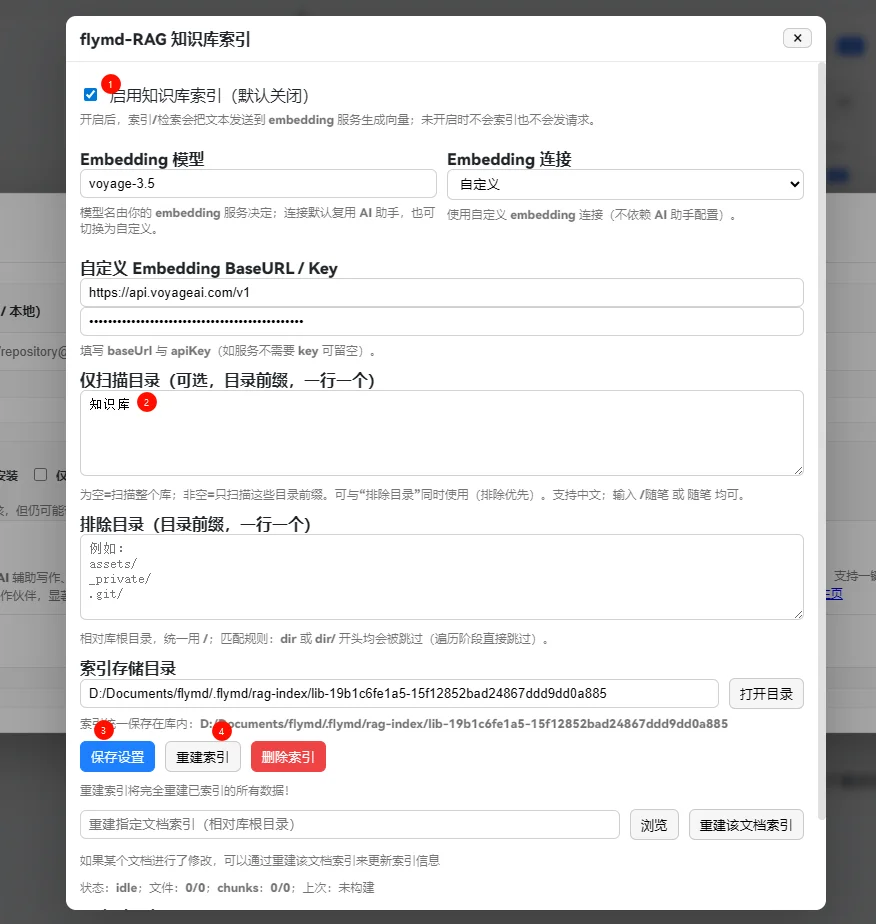 点击设置flymd-RAG知识库索引的设置按钮进入设置 ,截图中我使用的自定义连接的voyage3.5模型。如果你不会用没关系,你直接在embedding里选择内置的免费向量模型BAAI/bge-m3 无须进行KEY和API的配置,只需要点击启用—保存设置—重建索引。