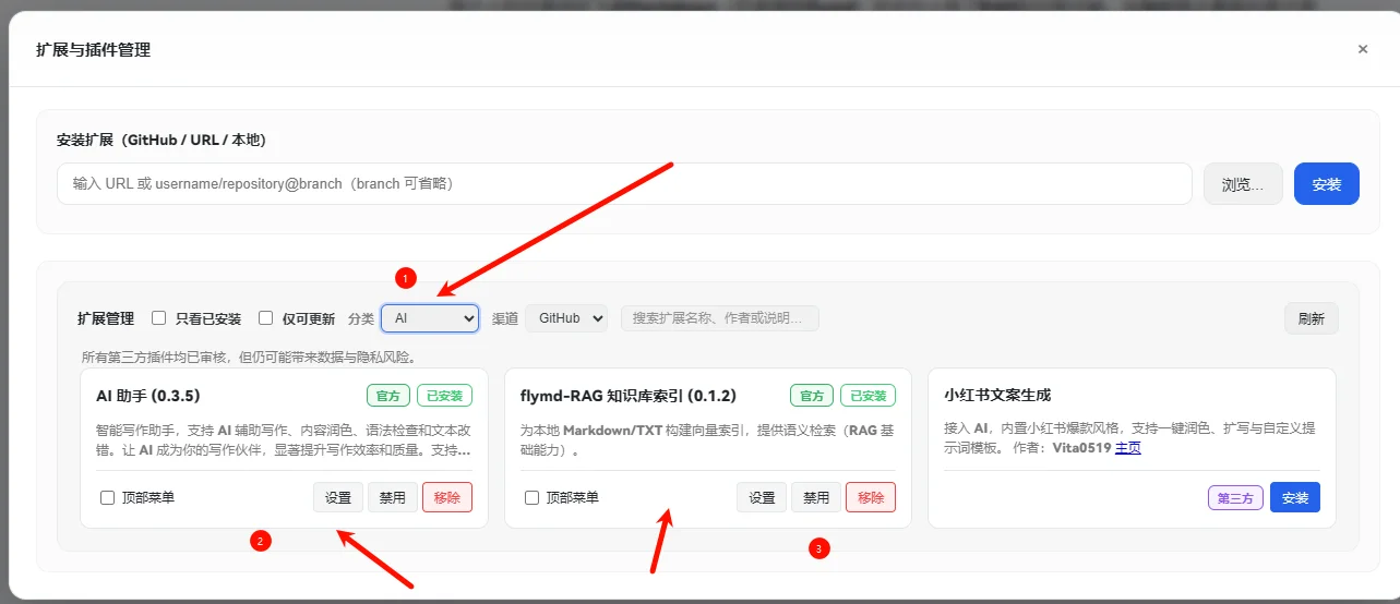 通过右上角的扩展菜单进入扩展市场,安装AI和RAG插件